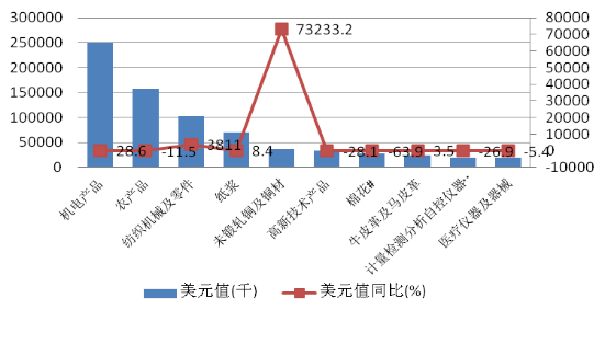 在鼓勵(lì)外資政策措施的引導(dǎo)下,我區(qū)外商投資企業(yè)和中外合作企業(yè)積極調(diào)整產(chǎn)品結(jié)構(gòu),努力拓展?fàn)I銷渠道,深度開(kāi)發(fā)國(guó)際市場(chǎng),取得良好效果。同時(shí),作為新疆外貿(mào)主力軍的民營(yíng)企業(yè)進(jìn)出口仍占據(jù)主導(dǎo)地位。1-5月,呈現(xiàn)“國(guó)退民進(jìn)”態(tài)勢(shì),國(guó)有企業(yè)進(jìn)出口總額8.1億美元,同比下滑19.8%,民營(yíng)企業(yè)進(jìn)出口122.1億元,同比增長(zhǎng)13.7%,高于整體降幅6.9個(gè)百分點(diǎn),占進(jìn)出口總額的84.6%,(見(jiàn)圖9)。外資企業(yè)較有起色,其中,外商獨(dú)資企業(yè)進(jìn)出口40803美元,同比增長(zhǎng)12.8%。