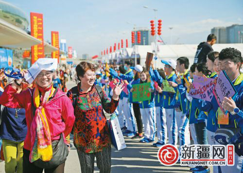 2016年9月25日,第五屆中國(guó)—亞歐博覽會(huì)圓滿落幕。亞歐博覽會(huì)的志愿者們舉著“大美新疆歡迎您”“后會(huì)有期”“中國(guó)—亞歐博覽會(huì)歡迎您再來(lái)”等祝福語(yǔ),在新疆國(guó)際會(huì)展中心西門(mén)列隊(duì)歡送參展商和觀眾。圖為當(dāng)日14 時(shí)50 分,來(lái)自重慶的游客陳女士揮手向志愿者們道別。(記者蔣曉攝)