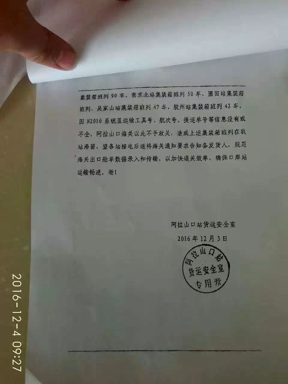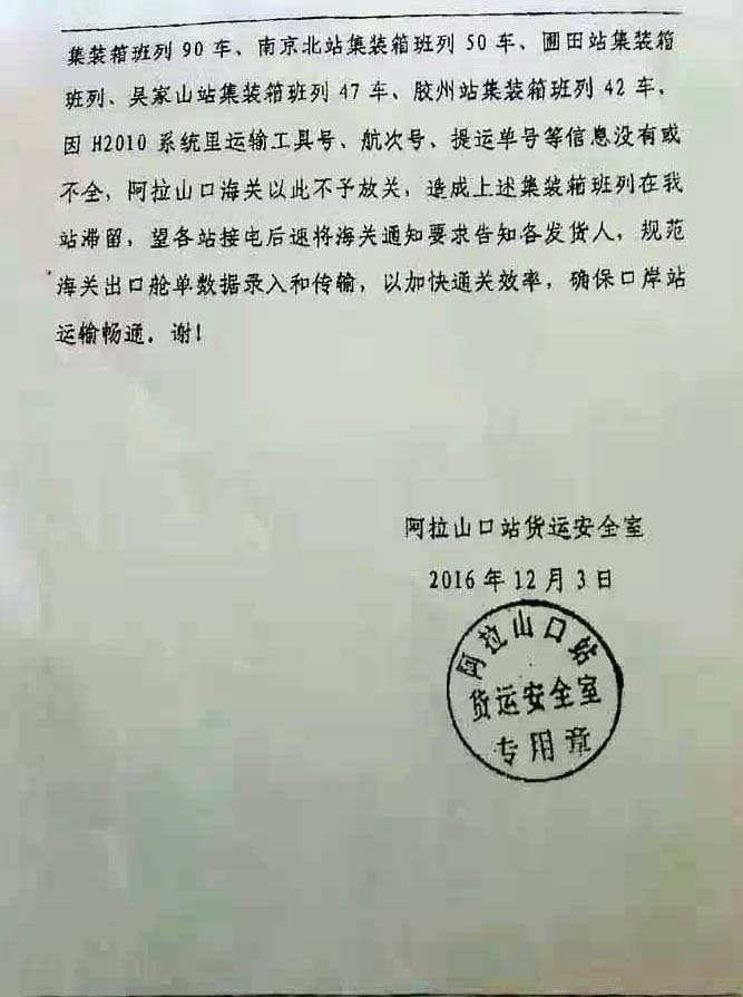 另外,各地班列陸續(xù)發(fā)車,造成新疆沿線堵車,致使從啟運(yùn)地到口岸的鐵路運(yùn)輸時(shí)間也不能保證,請(qǐng)知悉!